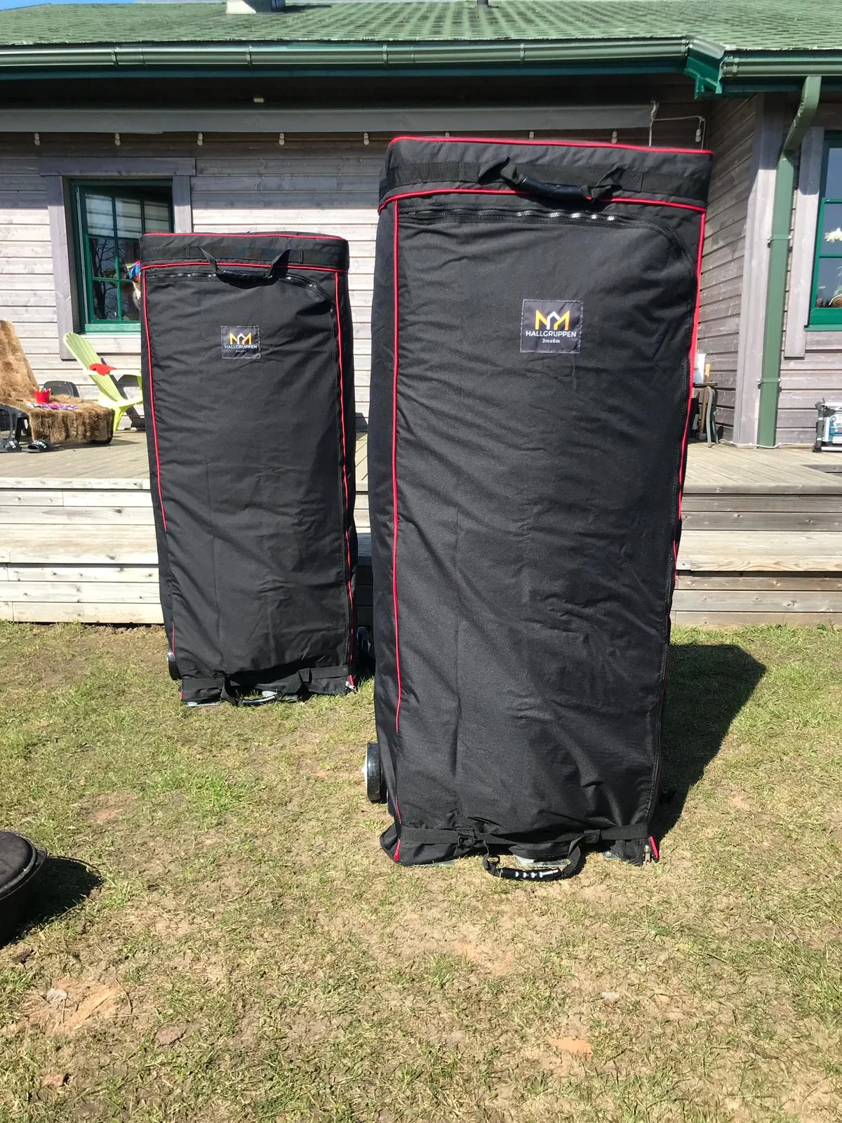 Nojumes ērti aprīkojamas ar caurredzamiem PVC logiem, sienām un durvīm. Iespējams savienot kopā palielinot noseguma platību. Komplektā iekļauti 120kg atsvari, atsaites un atsaišu mietiņi. Nojume ērti pārvietojama transporta somā. Soma ir aprīkota ar transporta riteņiem.