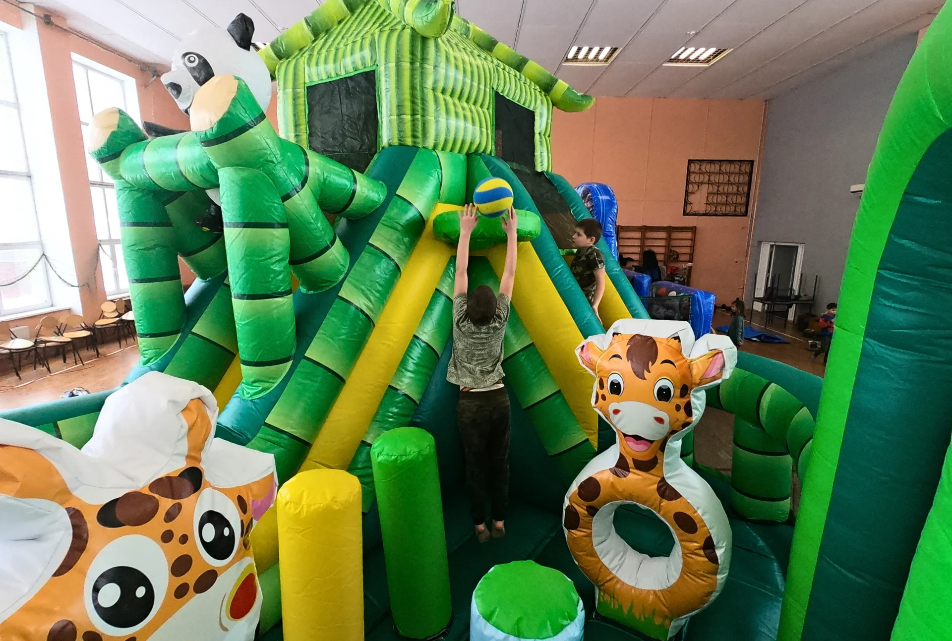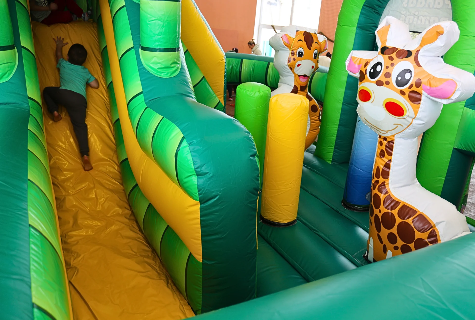 Panda Jūsu sētā? Kāpēc gan nē? Patīkami zaļās krāsas atrkacijā ir lēkājamā zona ar četriem šķēršļu elementiem, kā lielākais elements – žirafe. Lai nokļūt atrakcijas slidkalniņā ir iespējams izrāpties cauri šķērslim, vai apskriet tam apkārt, tad nonākot pie trepēm – uzrāpties augšā lai sasniegtu slidkalniņa virsotni un pandas mājiņu.